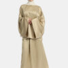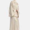The sleeves are generously oversized and drape smoothly over the arms, adding balance to the silhouette.
