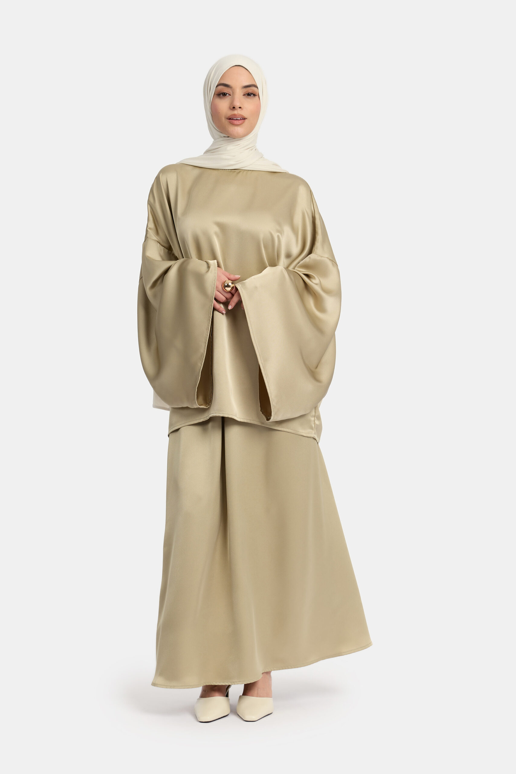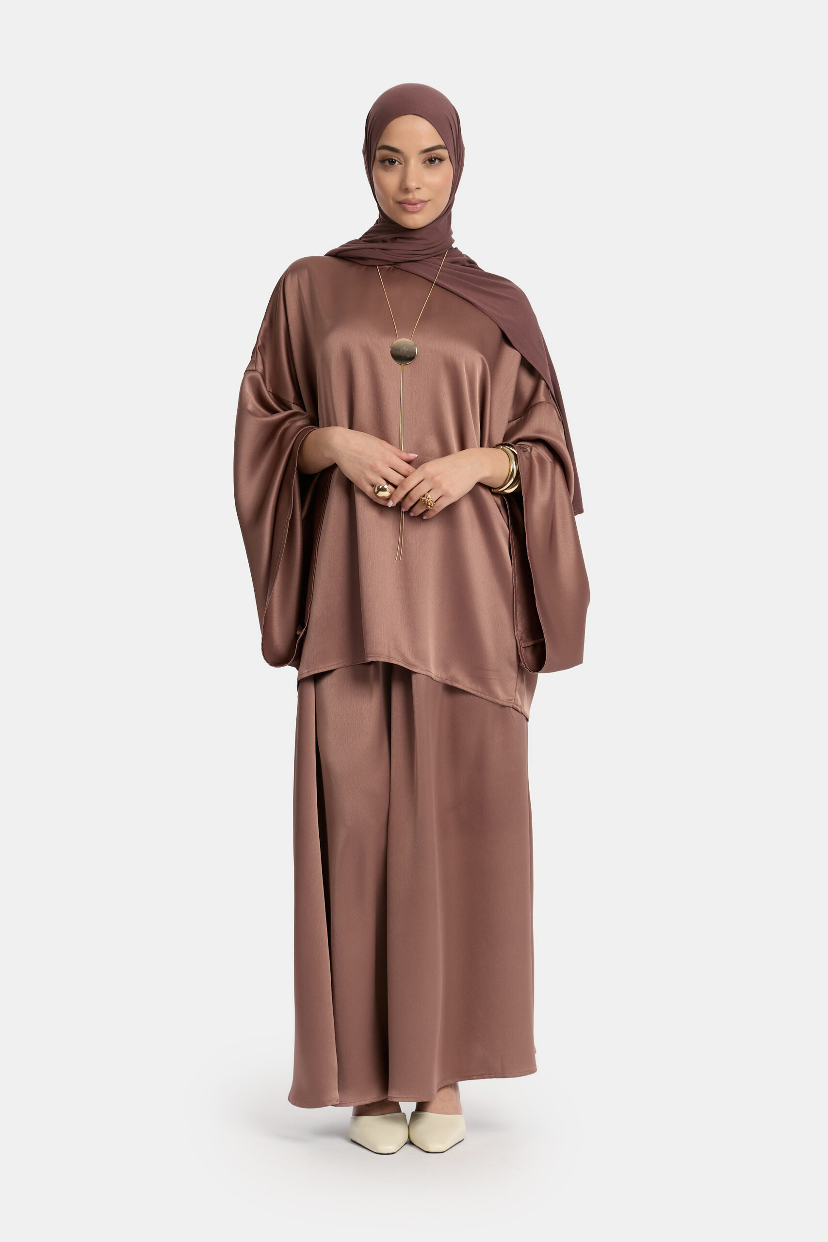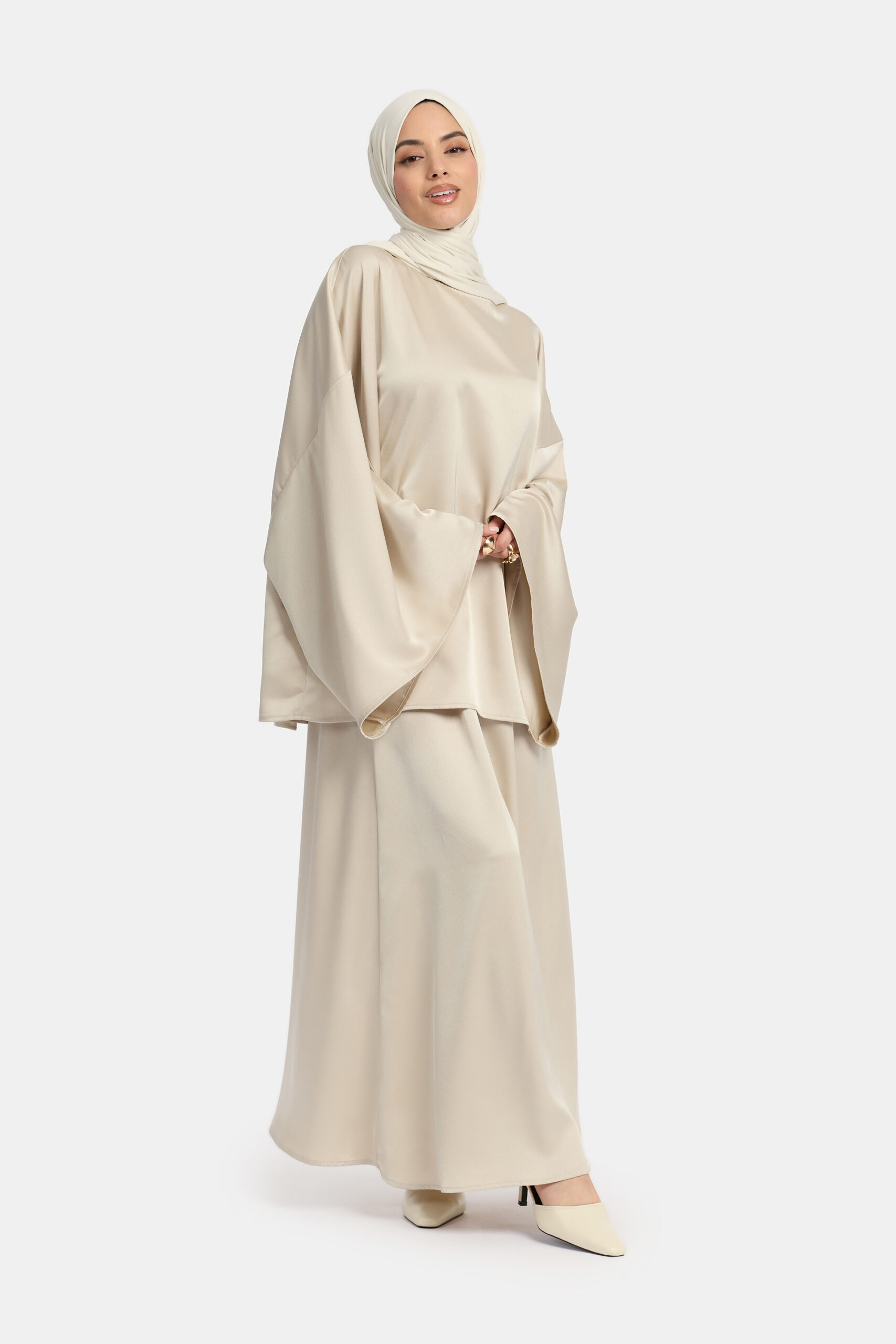 The cropped satin set is designed in a flowy, oversized fit that falls beautifully on the body. The satin fabric moves softly with every step, creating a calm and elegant look.