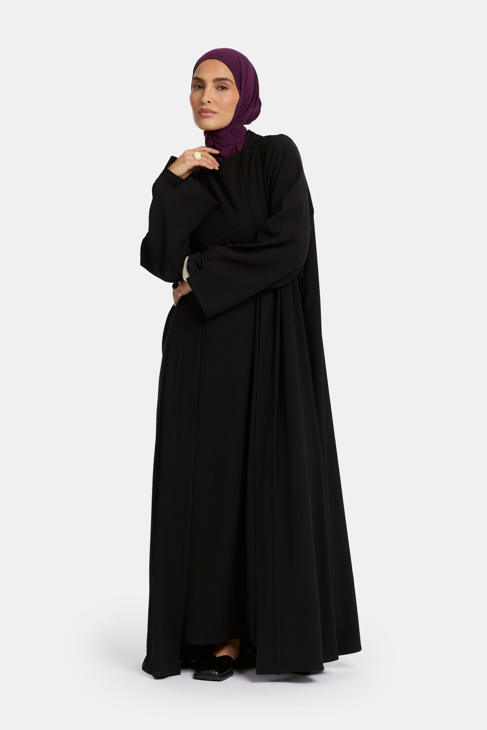 The Soft Skin Cut Abaya Set is made from a soft, textured fabric for a comfortable and elegant look. The matching underdress has long sleeves and is crafted from a thick, high-quality material, making it perfect for colder days. Together, they create a stylish and cozy outfit suitable for everyday wear or special occasions.